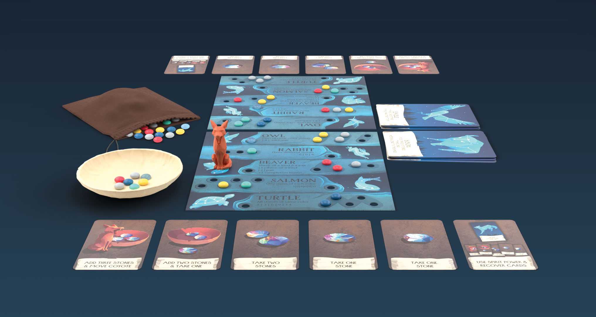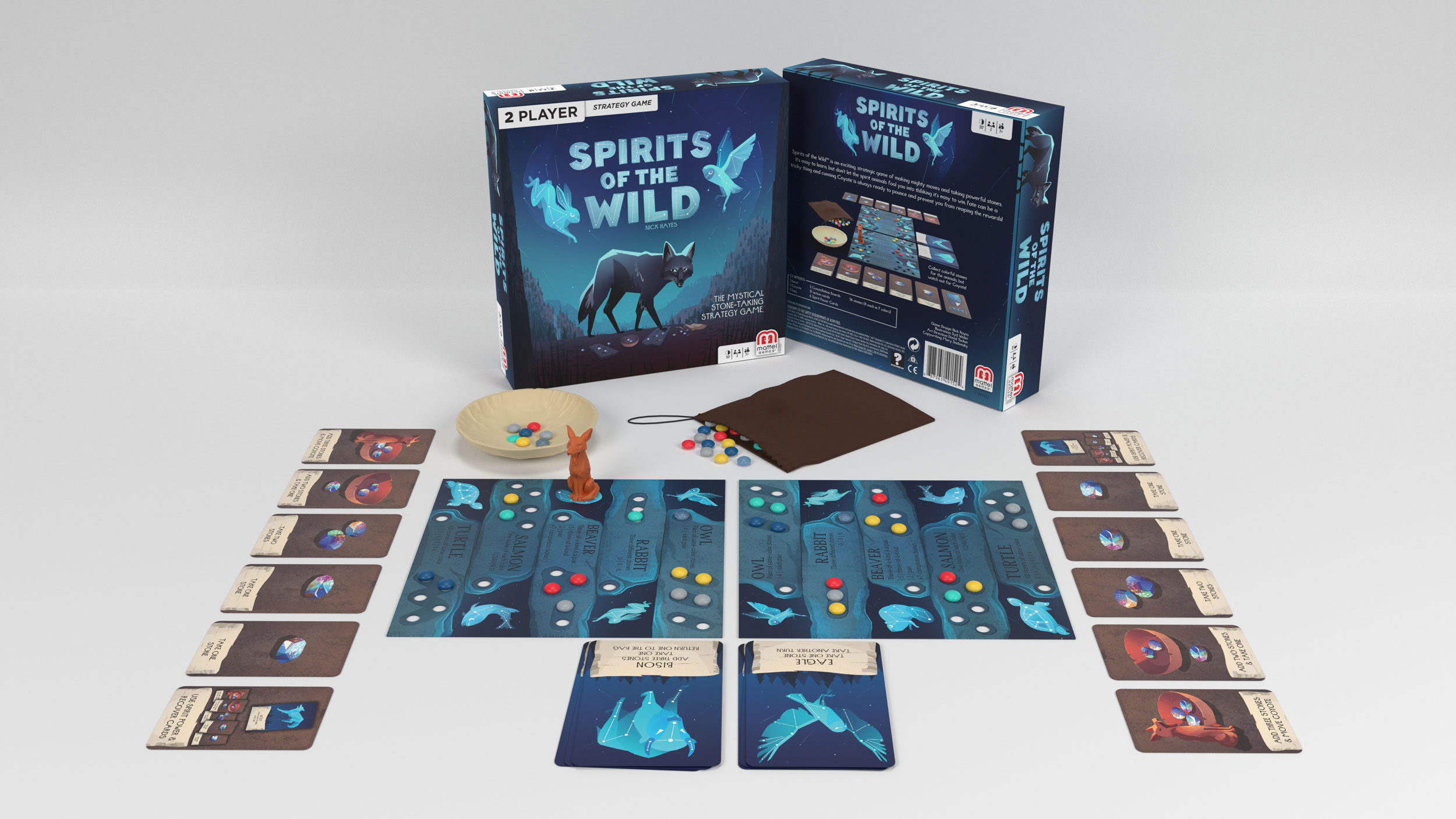 For Spirits of the Wild, I developed the theme and translated that into both package and product graphics. This involved creating a visual identity that not only reflected the game’s narrative but also resonated with its target audience. I concepted and art-directed all of the illustrations, working closely with the talented Syd Weiler to ensure the artwork brought the game’s mystical and nature-inspired themes to life. Syd’s style was a perfect fit, and my role was to guide the creative process, making sure each element aligned with the overall design vision.